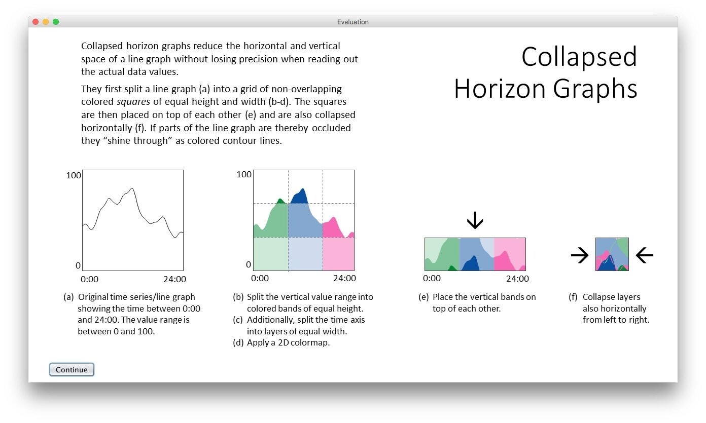 Screenshot from the study prototype explaining one of the four visualization techniques - Collapsed Horizon Graphs (CHG)
