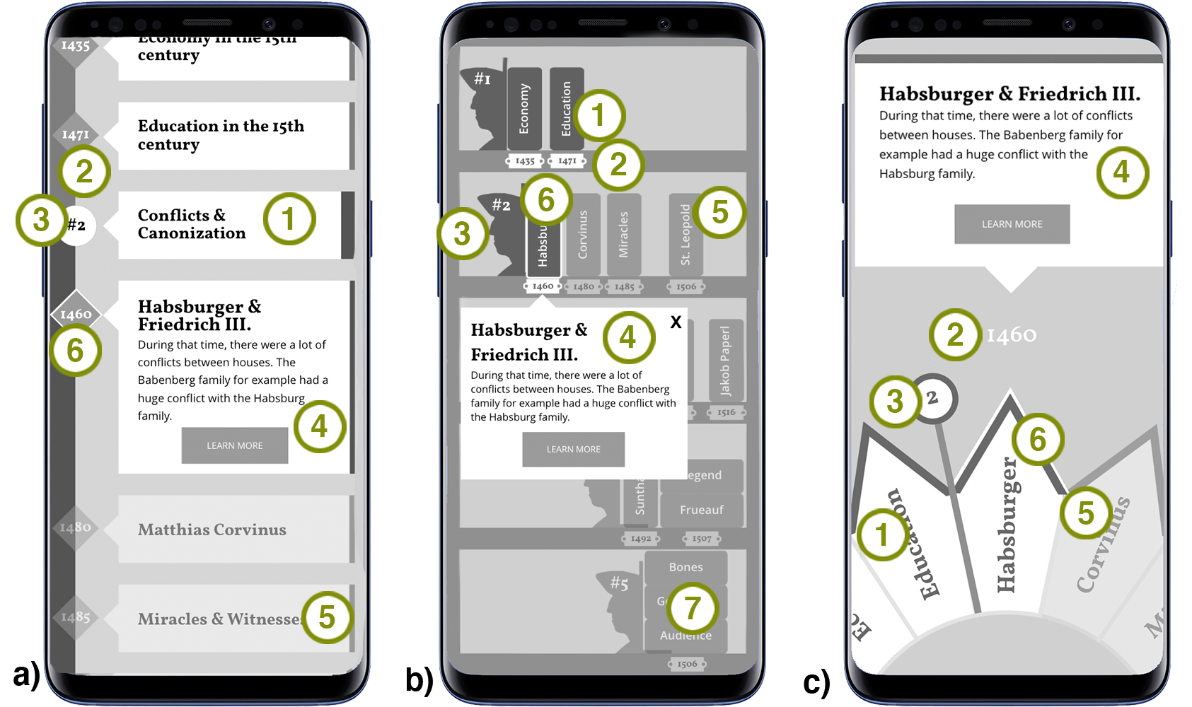 Design Study 1: Three design concepts for visualising historical data on mobile devices: Timeline, Bookshelf, Timeflower